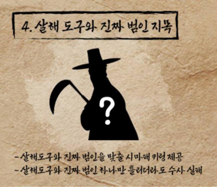 - 살해도구와 진짜 범인 하나만 틀리더라도 수사 실패